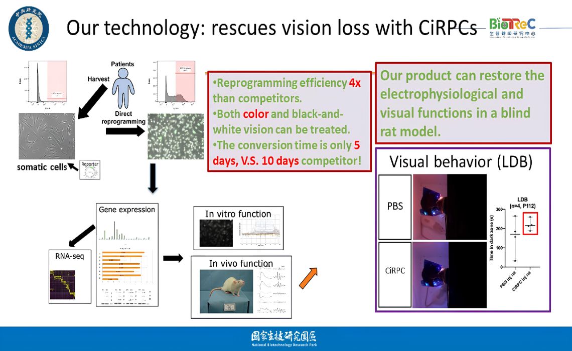 製備人工視網膜前驅細胞用以治療失明Generation of Retinal Progenitor Cells to Treat Blindness中研院 轉譯中心Biomedical Translation Research Center呂仁Jean Lu發明人:呂仁、蔡榮坤、李岳章、賴培倫、賴倩瑩領域:細胞治療適應症:黃斑部病變、糖尿病引起視網膜病病、夜盲症研發階段:臨床前新藥研究申請準備階段摘要:流行病學調查顯示,失明是一種令人恐懼的疾病,其對人類的影響超越了阿茲海默症和癌症。根據世界衛生組織的數據,全球約有10%的失明病例是由感光細胞退化引起的。我們的研究專注於解決感光細胞退化疾病所帶來的挑戰,市場價值預估將在2030年達到200億美元。本技術利用小分子藥物將人類纖維母細胞誘導為視網膜前驅細胞,轉化效率高達42.8%,僅需5天的時間。這項技術在臨床應用中具有便利性和低成本的優勢。該細胞轉化過程無需基因改造或病毒介入,在動物實驗中已驗證了其治療效果,並且沒有生成腫瘤的風險。與我們的主要競爭對手相比,他們只能拯救黑白視覺,而我們的產品可能能夠恢復黑白和彩色視覺,為患者提供更全面的視覺體驗。我們的技術在醫療市場上具有競爭優勢和發展潛力,特別是在黃斑部病變、糖尿病視網膜病變、和視網膜色素變性(罕見疾病)。我們將與醫療機構和製藥公司建立合作夥伴關係,實現視網膜前驅細胞在細胞治療中的應用,並為感光細胞退化患者提供新的治療選擇。