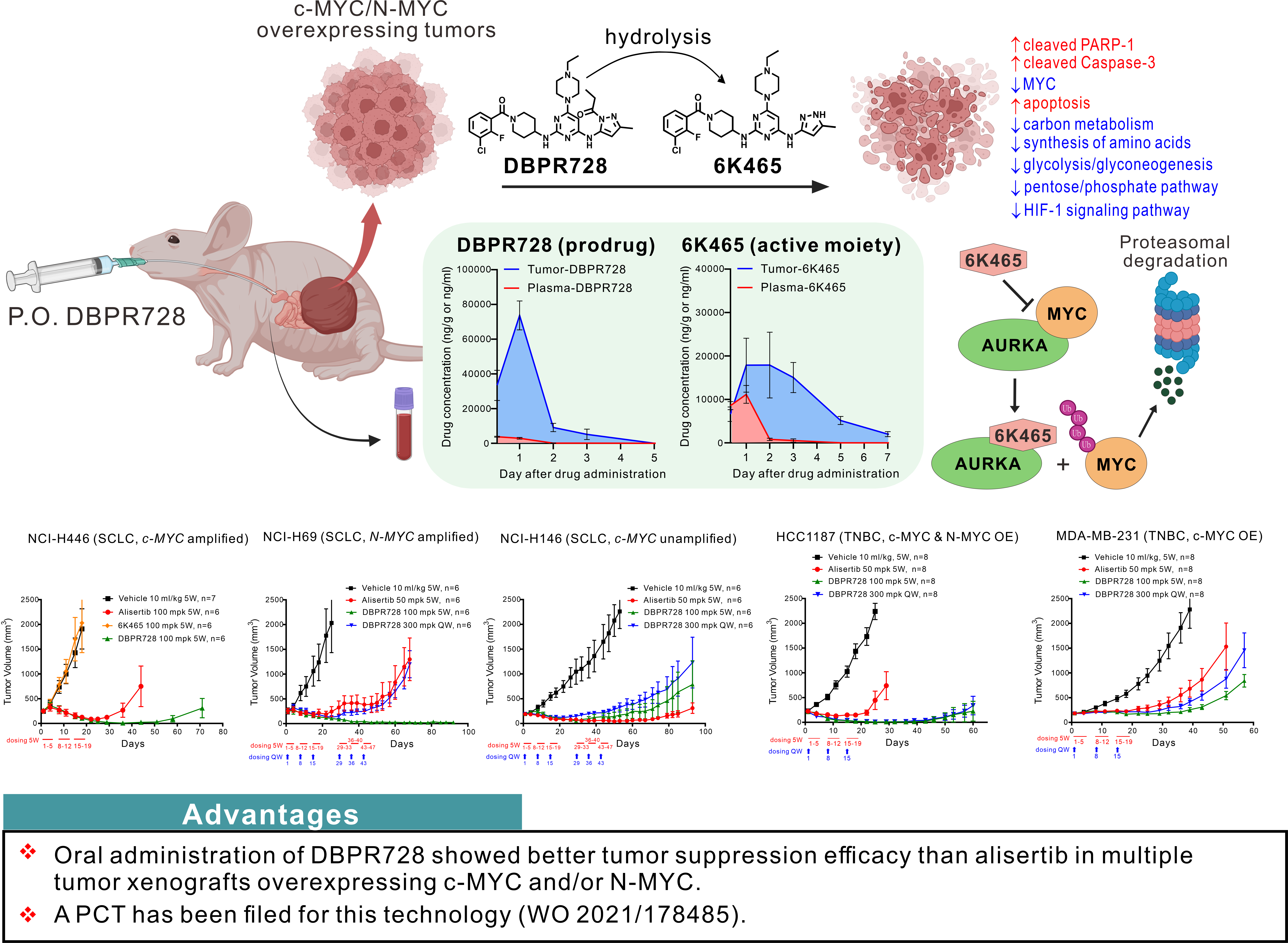 本技術所揭露之可促進MYC致癌蛋白質降解小分子口服激酶抑制劑DBPR728,在臨床上以帶有MYC致癌基因增幅或具MYC過表現的癌症為疾病標的,具有明確標靶治療生物標記,為first-in-class的新創藥物。帶有MYC基因增幅的腫瘤因為能夠充分利用糖酵解作用,促使癌細胞在缺乏氧氣的情況下進行能量代謝,因此生長速度快,術後復發率也高,造成病患的整體存活率下降。DBPR728具高度口服吸收性以及高腫瘤生體利用率,可有效降低腫瘤進行糖酵解作用,促使癌細胞凋亡,且對多種MYC高表達的異種移植腫瘤具消退效果。該技術已申請PCT國際專利(WO 2021/178485),並獲得台灣專利I770858。