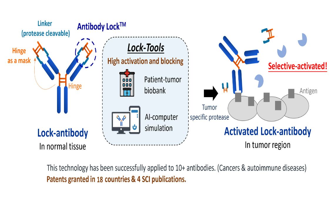 萬能抗體鎖Universal Antibody Lock碩準生技股份有限公司PrecisemAb Biotech Co., Ltd.呂韻綺Yun-chi Lu發明人:鄭添祿,莊智弘,柯秀芬,呂韻綺領域:新藥開發適應症:頭頸癌,直腸癌,肺癌研發階段:臨床前摘要:「萬能抗體鎖技術」透過創新的屏蔽結構,有效改善現今抗體藥物選擇性不足的問題,提升抗體對疾病區域的選擇性,大幅降低藥物副作用,不僅為抗體藥物安全性帶來革命性突破,也大大提高病人的生活品質。該技術可應用於單克隆抗體藥物、抗體藥物複合體(ADC)、雙功能抗體等領域。PSM101 使用碩準獨創的抗體鎖技術改造已上市的 anti-EGFR 抗體 Erbitux®,形成 Lock-EGFR Ab。臨床發現,使用 EGFR 小分子或單克隆抗體治療癌症的患者,其治療效果與皮膚毒性程度相關。治療效果越好,皮膚毒性越嚴重,導致患者需要降低劑量或中止治療。為解決此問題,碩準授權自高醫大鄭添祿教授團隊的抗體鎖技術平台,使 PSM101 僅在腫瘤部位被腫瘤特異性蛋白酶活化,專一性結合腫瘤,發揮毒殺和生長抑制作用,同時減少對正常組織的非特異性結合。此平台能通過基因工程加裝抗體鎖,減少對正常細胞的傷害,並在疾病區域通過蛋白酶解鎖抗體功能,達到精準治療效果。