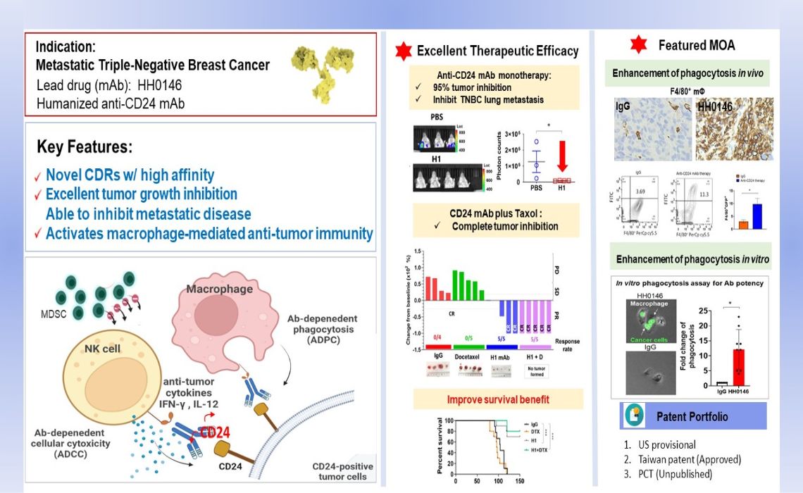治療性人源化CD24單株抗體作為新一代的免疫標靶療法Therapeutic humanized anti-CD24 mAb as a next-generation immune targeted therapy中國醫藥大學Chinal Medical University詹世萱Shih-Hsuan Chan發明人:詹世萱, 王陸海, 徐祖安, 洪慧貞領域:單株抗體新藥適應症:轉移性三陰性乳癌研發階段:Pre-clinical摘要:Triple-negative breast cancer (TNBC) is the subtype of breast cancer that is most prone to recurrence and distant metastasis. The limited availability of targeted therapies makes it a significant challenge in clinical breast cancer treatment, resulting in an unmet medical need for metastatic TNBC. In 2019, our research team was the first to propose the potential of anti-CD24 therapy as a new treatment for metastatic TNBC. Recently, CD24 has been confirmed as an immune checkpoint in macrophages, opening new opportunities for the next generation of immune checkpoint therapies. Our team has developed the therapeutic humanized anti-CD24 antibody HH0146, which is at the forefront of domestic patent technology for humanized anti-CD24 antibody targeting tumors. HH0146 can specifically activate the excellent phagocytosis of macrophages while also activating natural killer cells to kill tumors, thereby modulating the tumor immune microenvironment and achieving outstanding anti-tumor efficacy. The HH0146 antibody has obtained a Taiwanese invention patent and has completed international patent application filings (PCT/US24/13014: unpublished).