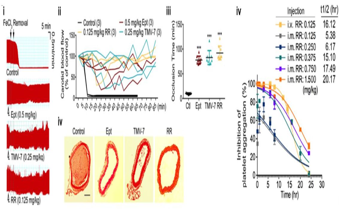 The current fibrinolytic therapy or percutaneous coronary intervention (PCI) needs to be combined with anti-platelet drugs in a case of subsequent restenosis or recurrent thrombosis. However, antiplatelet coagulant drugs are associated with bleeding and thrombocytopenia side effects that need to be addressed. αIIbβ3-specific antagonists (RR) have higher antiplatelet activity and do not affect platelet adhesion and bleeding. The bleeding model showed that Tmu RR mutant exhibited similar bleeding time as control and had >10-fold decrease in bleeding time as compared with the commercial abciximab. We also found that RR exhibited the 50% activity to inhibit platelet aggregation of 17 hrs using intramuscular injection, suggesting that RR is more convenient in use.