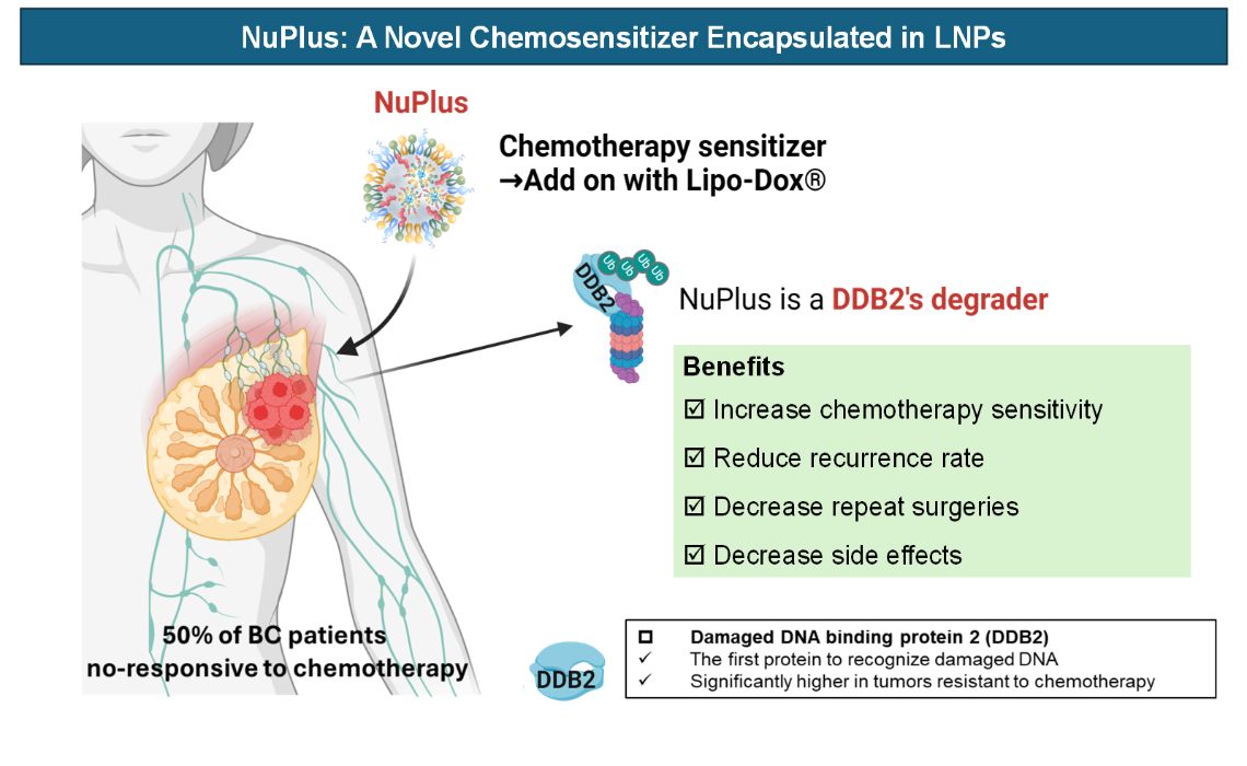 Chemotherapy is the standard treatment for all subtypes of breast cancer, but its overall response rate is only 50%. NuPlus addresses this clinical need by becoming the first nucleic acid-based chemosensitizer targeting DDB2. By enhancing chemotherapy sensitivity, reducing drug dosage and side effects, and effectively inhibiting tumor growth, NuPlus aims to provide better treatment options and improve patients' quality of life. Utilizing lipid nanoparticles (LNP) for drug delivery, the next phase involves collaborating with GMP pharmaceutical companies for system encapsulation and licensing, ensuring mutual rapid profitability. Having completed the PoC stage, NuPlus is set to enter critical drug development. With funding from the Taiwan Germination Program, we will conduct non-GLP pharmacodynamic validation, preliminary safety assessment, and basic pharmacokinetic testing, preparing for the preclinical trial phase.