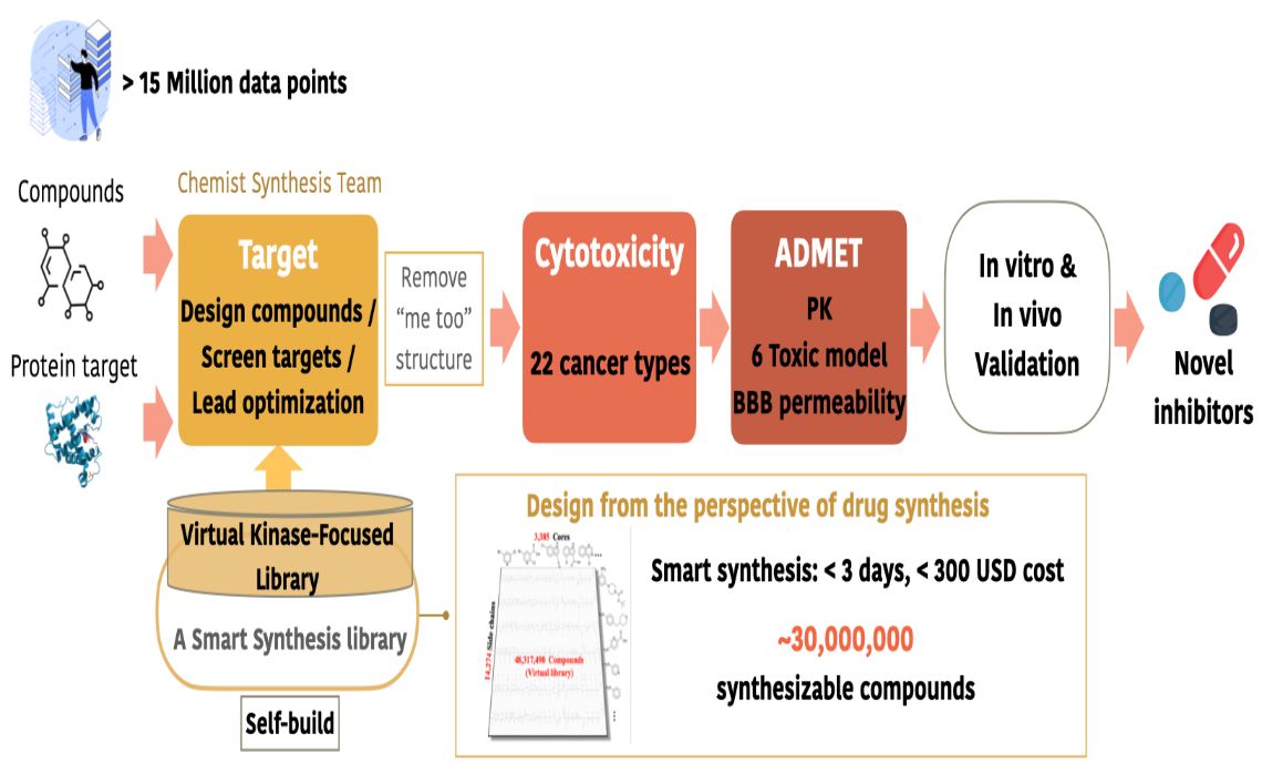 The smart innovation platform for preclinical drug development addresses the high failure rate problem for small molecule new drug developers. We provide AI research and development services as well as early-stage new drug products. Our value lies in speed and efficiency: an 80% synthetic rate for novel structures, a 90% reduction in synthesis costs, and a 60% validation efficiency in cell experiments (IC50 < 10µM). It is expected to reduce preclinical development timelines to within two years. Compared to other AI companies, our team, composed of experts in chemistry, biology, and AI, effectively addresses the synthesis challenges posed by AI-designed new structures. In the past four years, our team has used this platform to develop 29 high-potential novel small molecule inhibitor projects, most of which have no competitive products in the clinical stage, and have served 18 domestic and international clients.