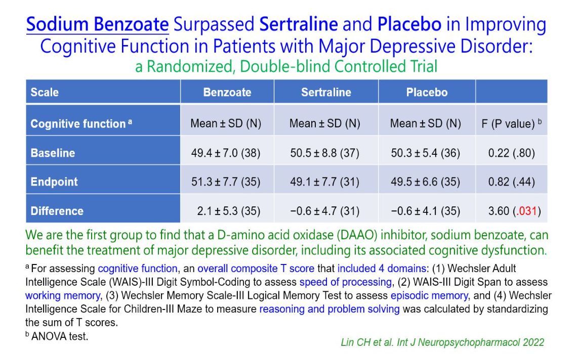 右旋胺基酸氧化酵素抑制劑治療鬱症D-amino acid oxidase (DAAO) inhibitor for the treatment of depression高雄長庚紀念醫院精神部、中國醫藥大學生物醫學研究所Kaohsiung Chang Gung Memorial Hospital, China Medical University Graduate Institute of Biomedical Sciences林潔欣、藍先元Chieh-Hsin Lin, Hsien-Yuan Lane發明人:林潔欣、藍先元領域:新穎藥物/New Drug適應症:鬱症/Major depressive disorder研發階段:申請試驗用藥物/新醫材(試劑) Investigational New Drug (IND)/ Investigational Device Exemption (IDE) application摘要:鬱症是重大精神疾病。目前的抗憂鬱劑作用主要是建立在單胺理論,然而療效不佳、特別是對感知壓力與認知功能更是效果有限,並且有明顯的副作用。NMDA受體功能低下已被認為與鬱症的病理機轉有關。苯甲酸鈉是一種右旋胺基酸氧化酵素(DAAO)抑制劑,能提高右旋胺基酸的濃度,進而促進NMDA神經傳導。發明人經由兩項隨機雙盲臨床試驗發現苯甲酸鈉可以安全有效地改善鬱症患者的憂鬱症狀、感知壓力與認知功能,效果優於安慰劑與已上市抗鬱劑。本發明提出全新理論,係全球第一使用DAAO抑制劑治療鬱症,已獲得六國專利保護,可望發展為新一代鬱症治療藥物。
